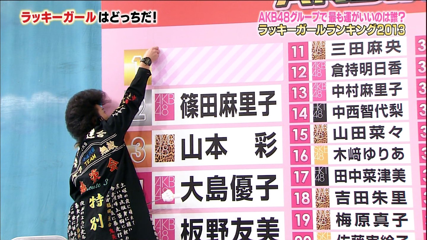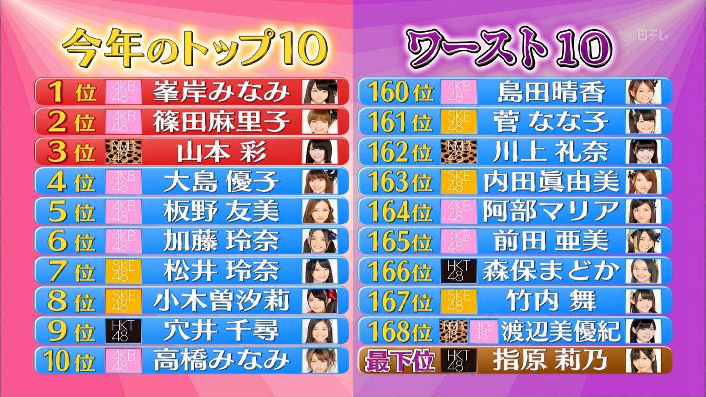 去年の1位たかみな、ビリのゆきりんといい、必ずバラエティメンが1位かビリ。
