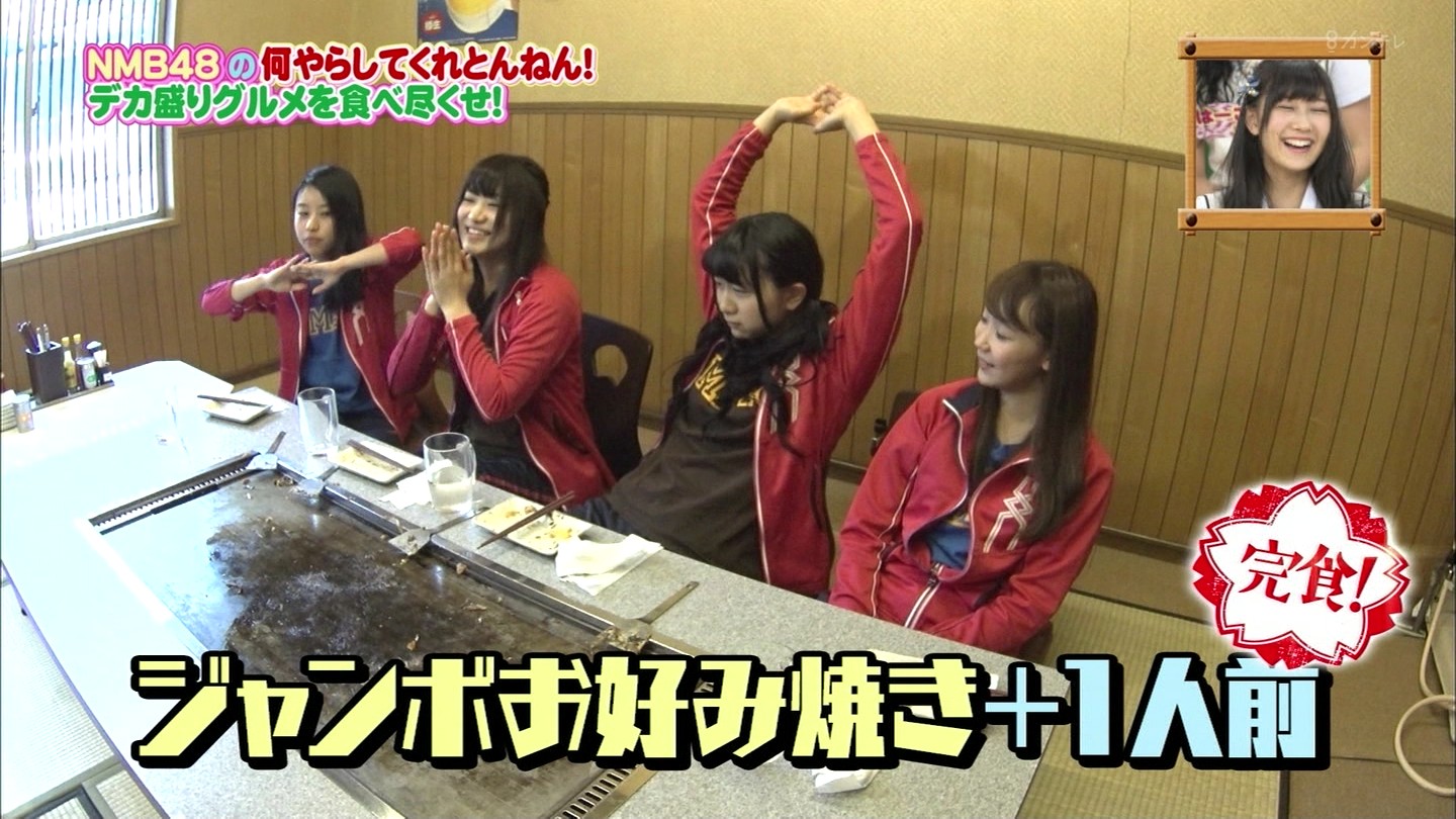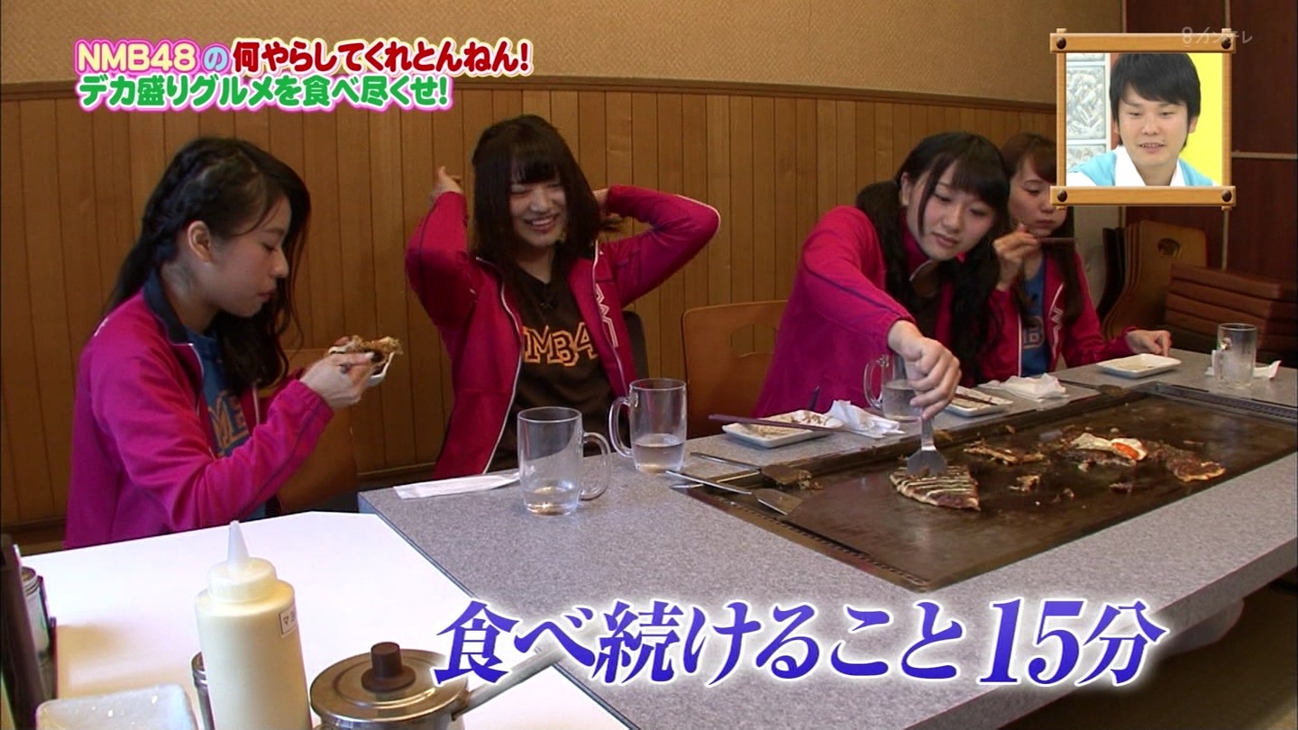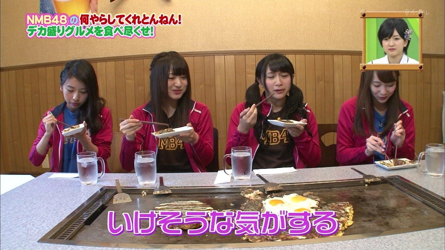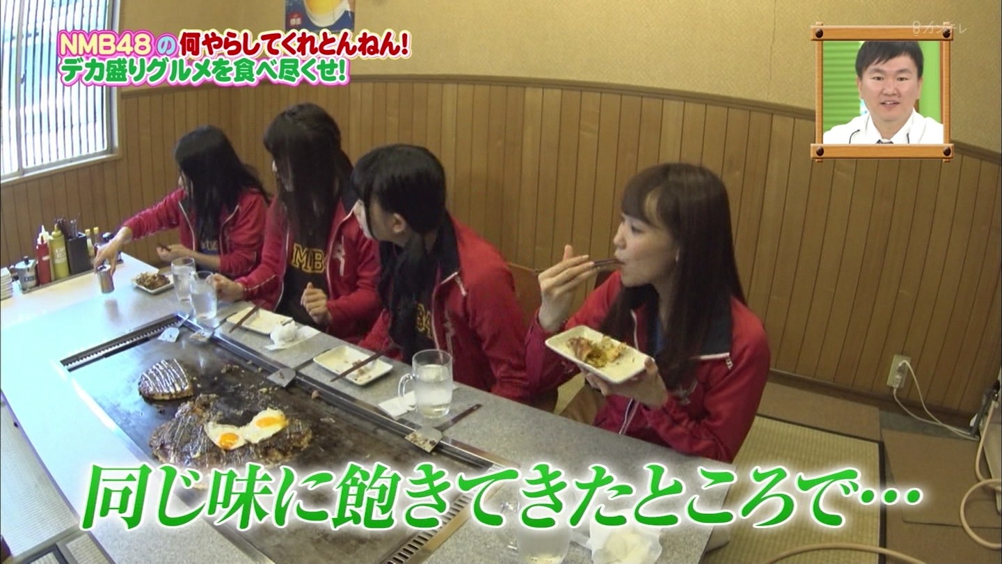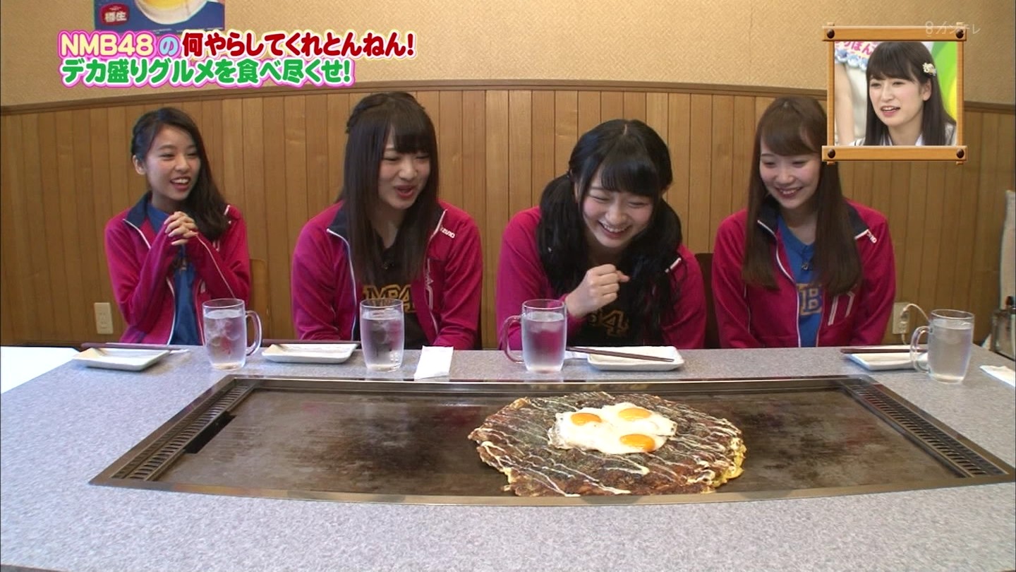 京都では直径40cmのジャンボお好み焼きに!大阪では重さ1.3kgの炭焼き炙り重に挑戦!最初はアイドルらしい笑顔全開だったのに、次第に苦悶の表情に…。