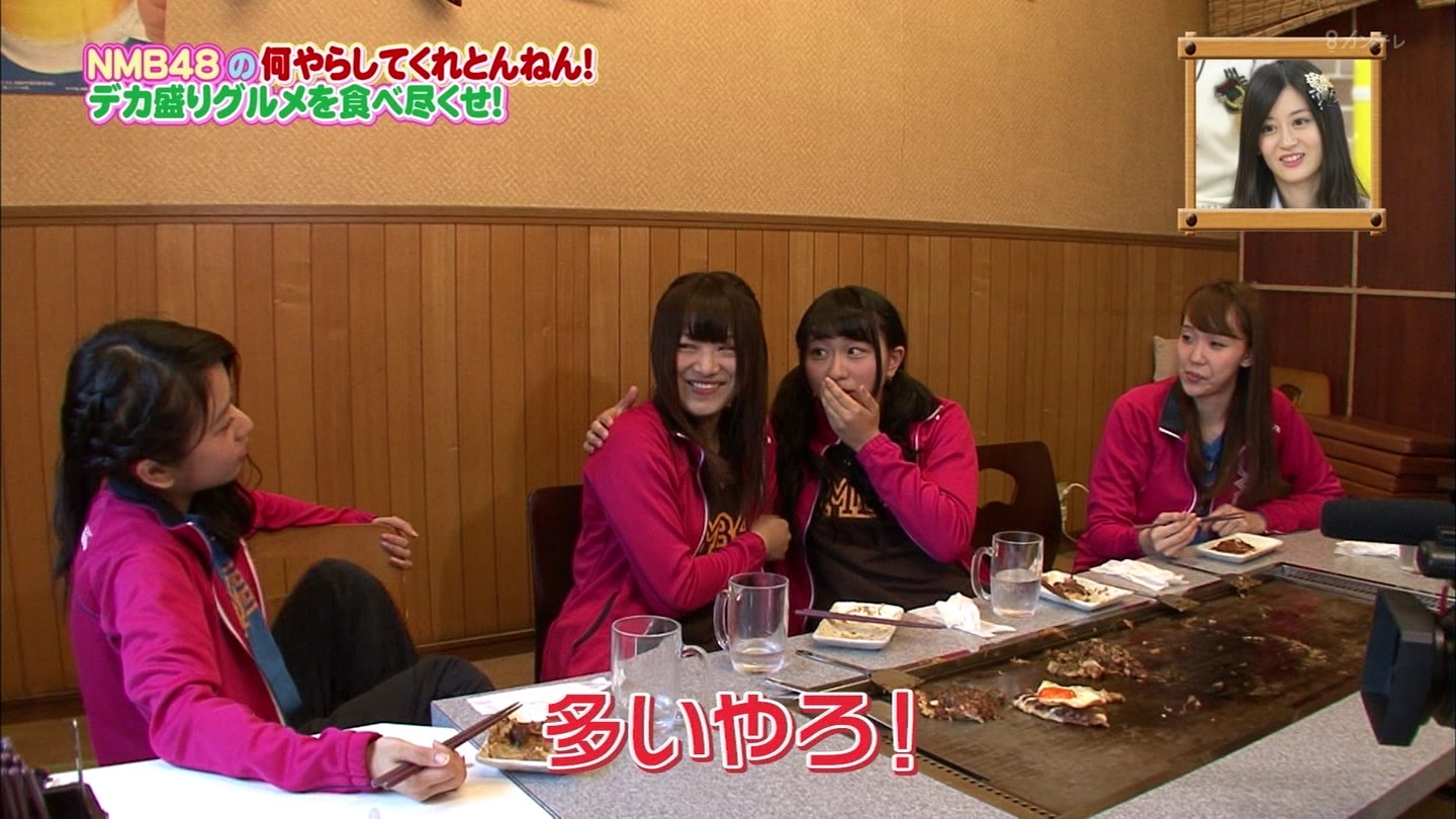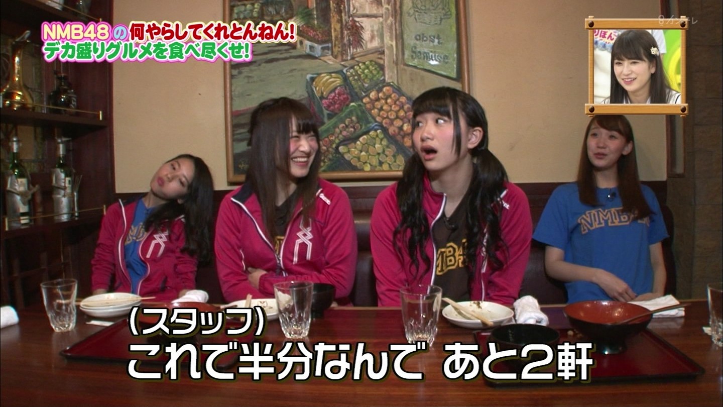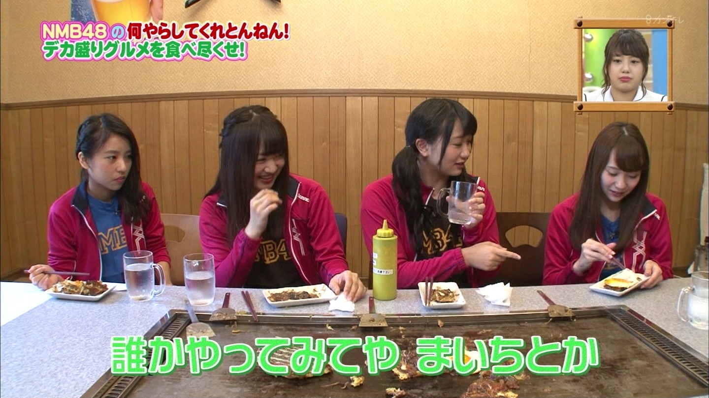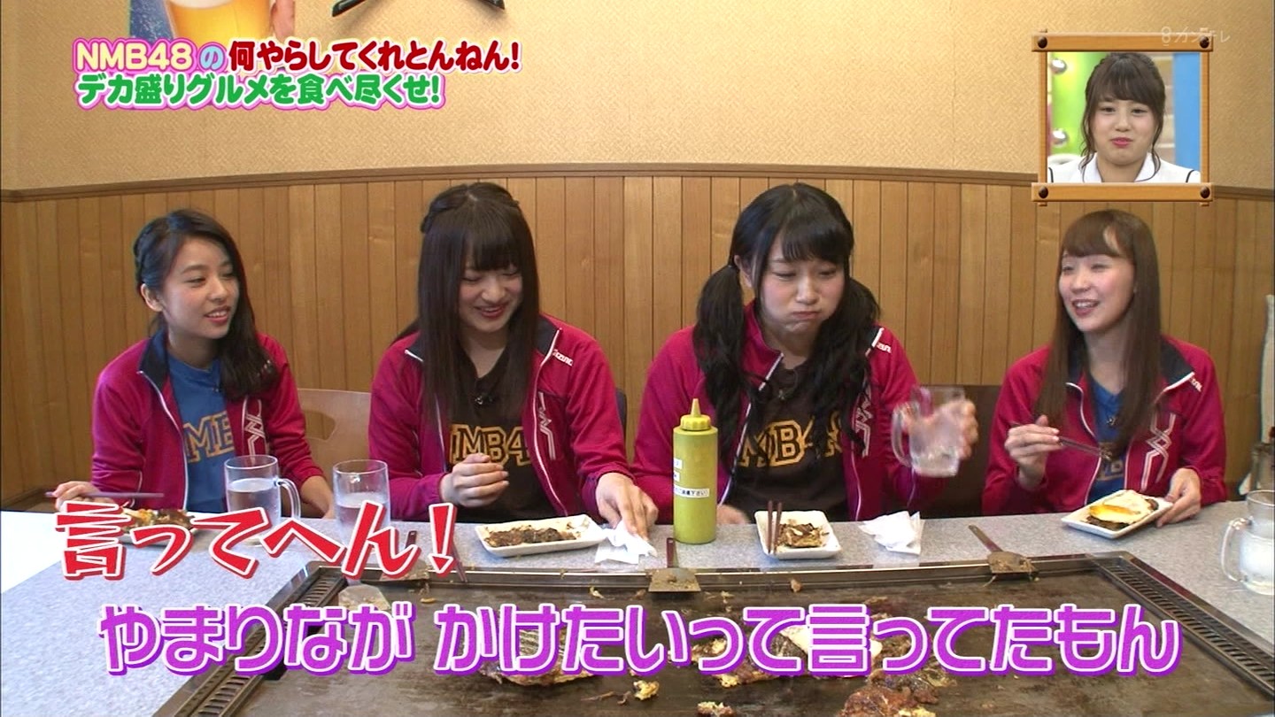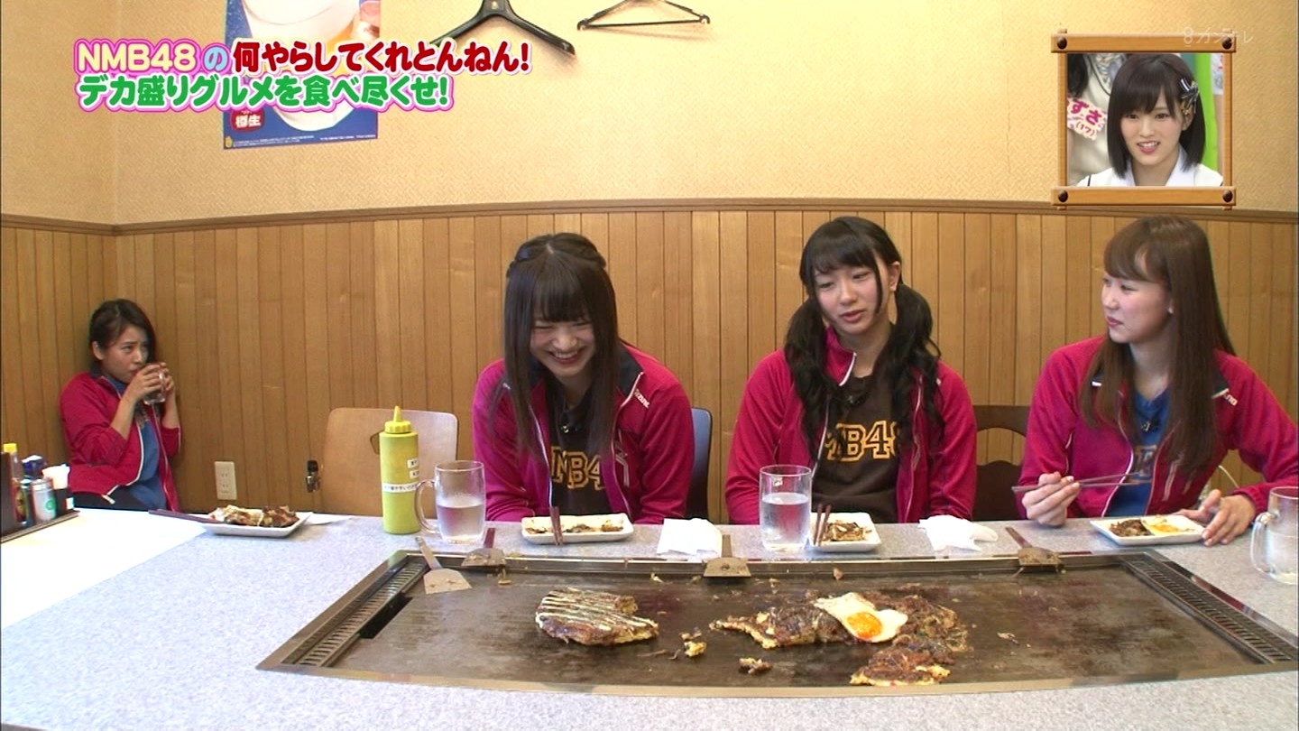 京都では直径40cmのジャンボお好み焼きに!大阪では重さ1.3kgの炭焼き炙り重に挑戦!最初はアイドルらしい笑顔全開だったのに、次第に苦悶の表情に…。