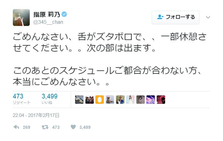 指原莉乃は体調不良により6部の個別握手会を中止とさせていただきます。