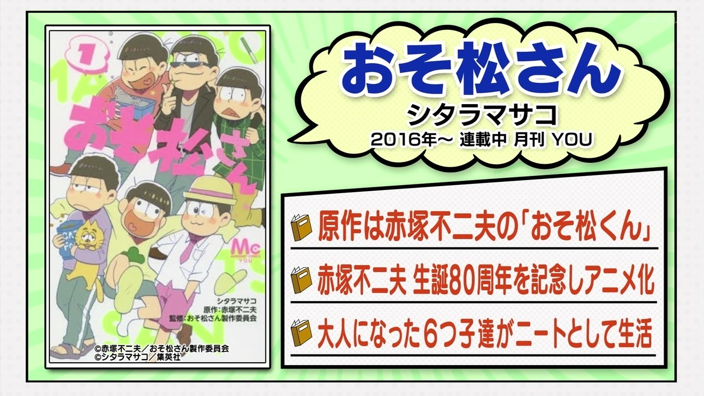 まずはあの名作が進化して復活!?伝説のギャグマンガ『おそ松くん』が全員ニートの『おそ松さん』に♪『ど根性ガエル』がサンリオとのコラボで『ど根性!!けろけろけろっぴ』に♪