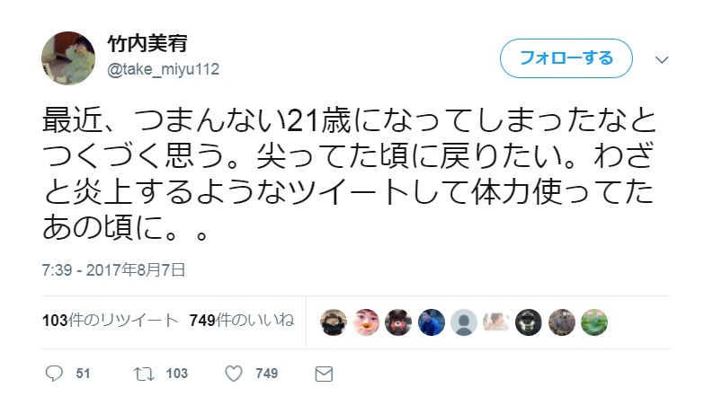 最近、つまんない21歳になってしまったなとつくづく思う。尖ってた頃に戻りたい。わざと炎上するようなツイートして体力使ってたあの頃に。。