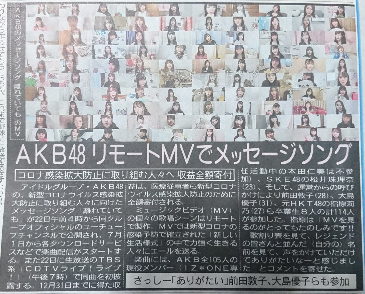 AKB48リモートMVでメッセージソング 卒業生8人含む114人参加 医療従事者らへ収益全額寄付