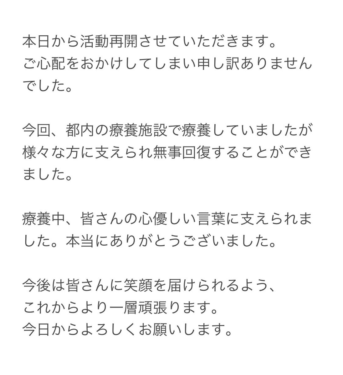 本日から活動を再開出来る事になりました!ファンの皆様を沢山お待たせし、ご心配をおかけしてしまいすみませんでした😿