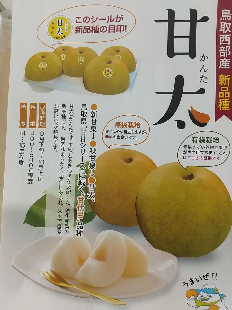 徳永さんが持っている梨は、県西部産の甘太(かんた)という梨で、鳥取県の新甘泉(しんかんせん)秋甘泉(あきかんせん))の甘甘シリーズ 甘代目の品種!