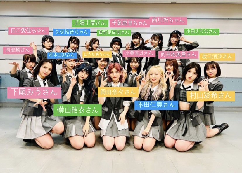 岡田奈々、岡部麟、小栗有以、小田えりな、柏木由紀、久保怜音、倉野尾成美、坂口渚沙、下尾みう、