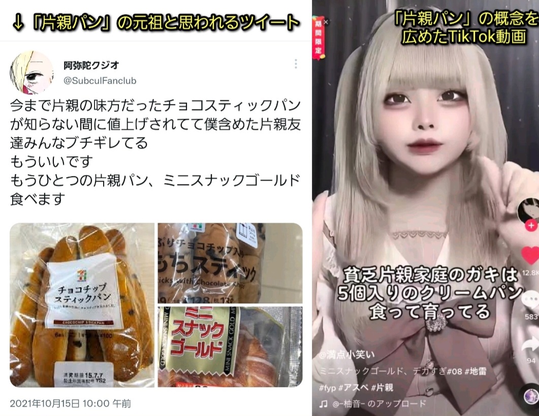 "片親パン"と並んで陳列されて