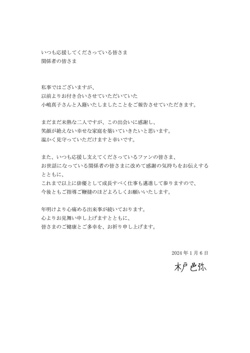同時刻に木戸も自身のXを更新し、同様の書面とともに入籍を公表。ファンや関係者に「これまで以上に俳優として成長すべく仕事も邁進して参りますので、今後ともご指導ご鞭撻のほどよろしくお願いいたします」と記した。