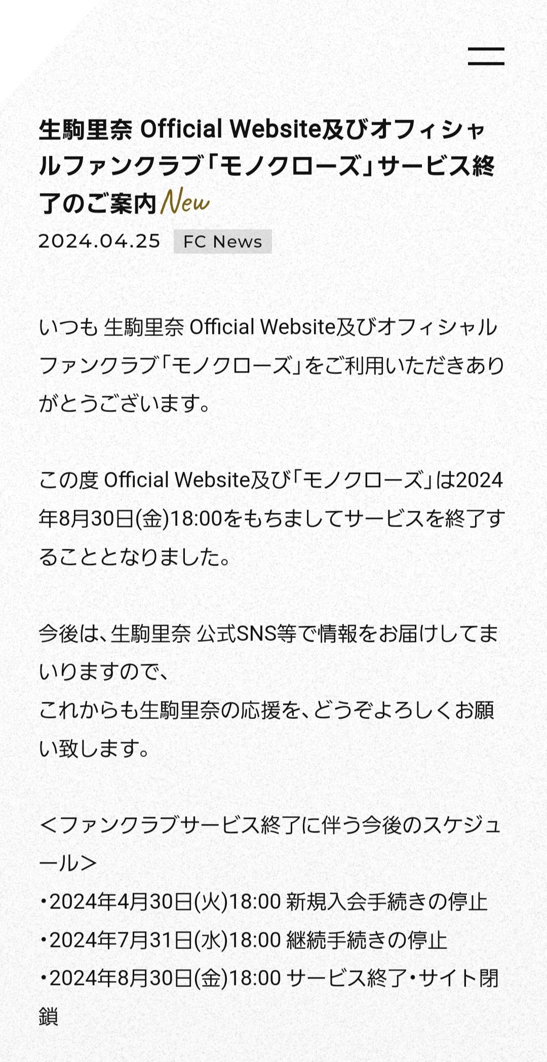 同サイトでは「この度生駒里奈Official Website及び『モノクローズ』は2024年8月30日(金)18:00をもちましてサービスを終了することとなりました」とアナウンスされた。9月以降は、公式SNSなどを通じて情報を届けるとしている。