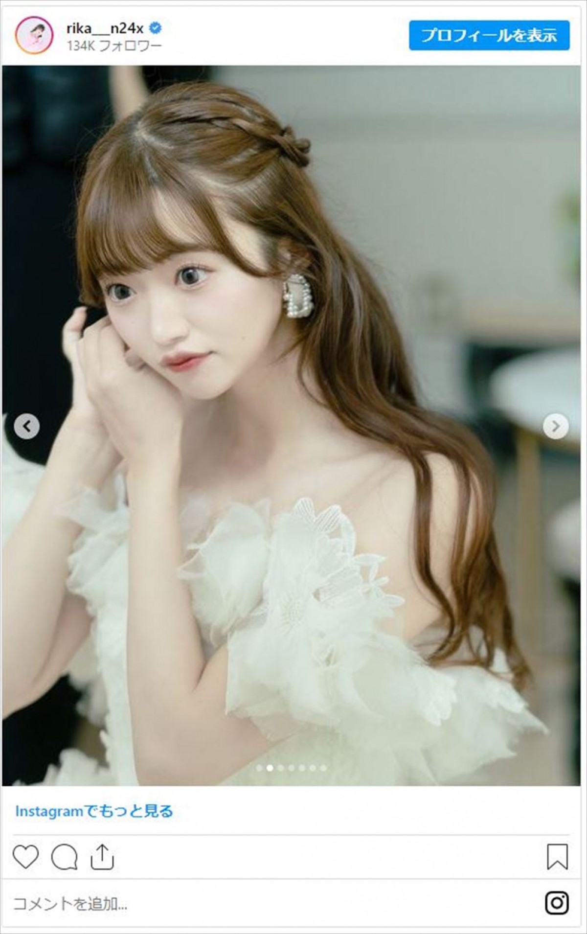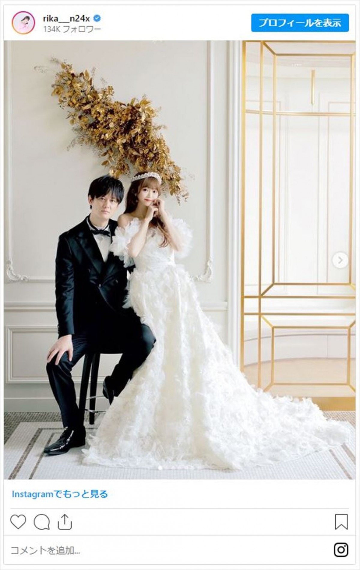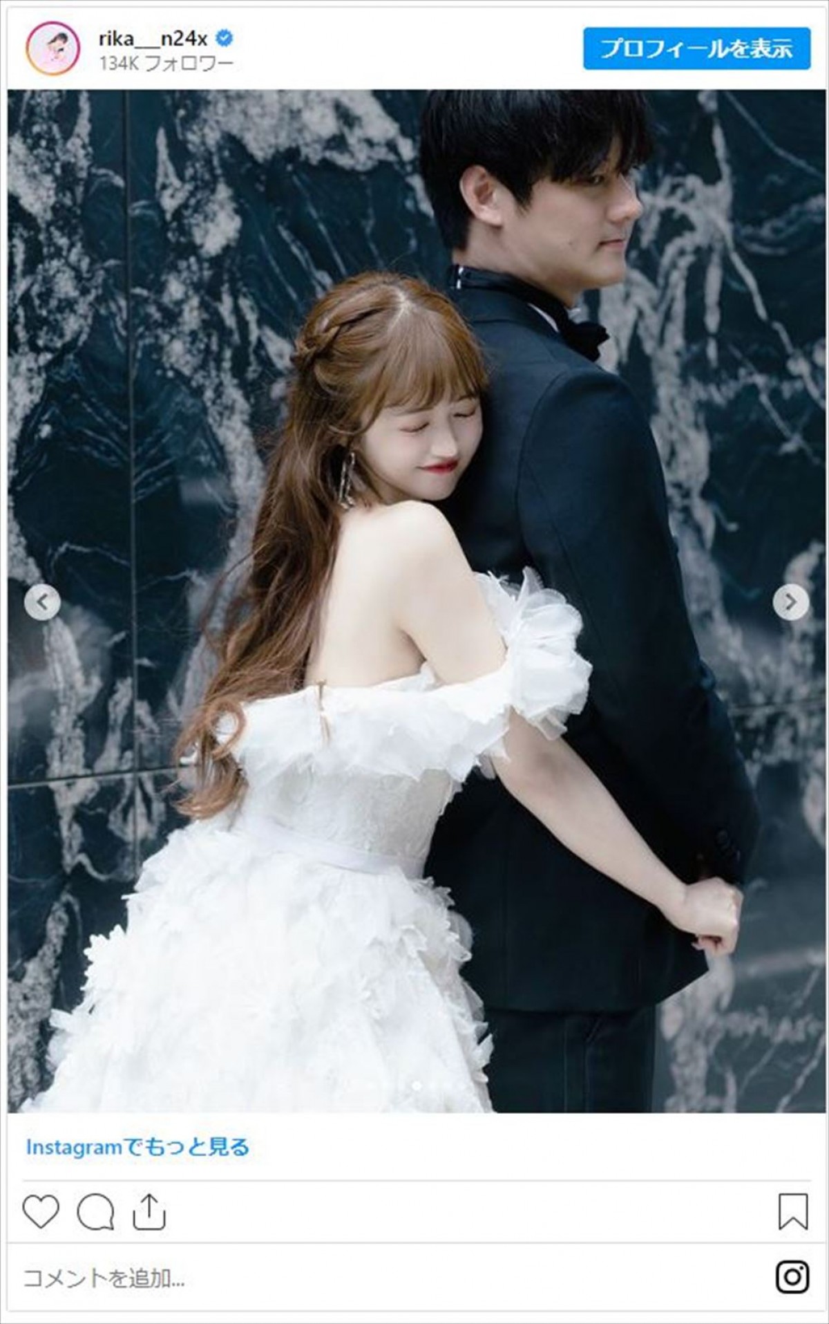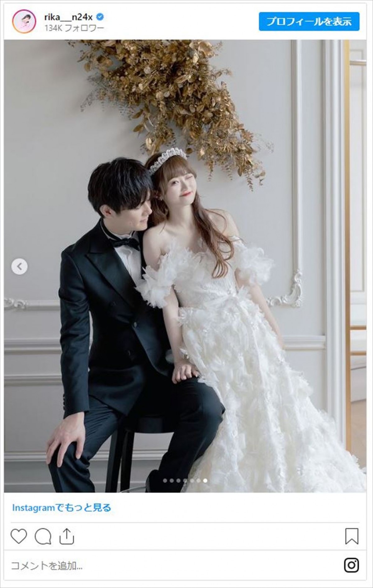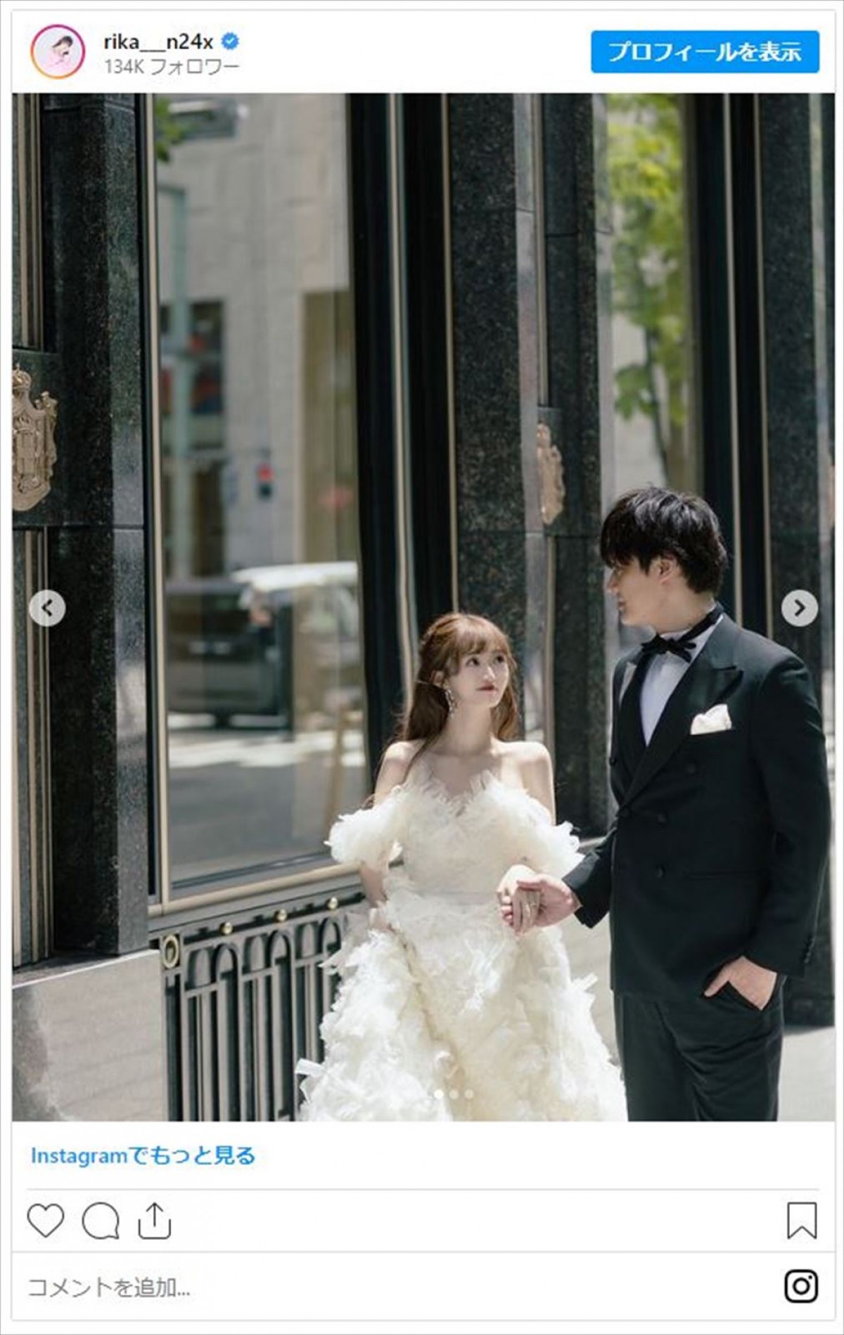 3月に一般男性との結婚を発表した、NGT48の元メンバーでタレントの中井りか(26)が29日、Instagramを更新。夫とのウェディングフォトを披露し「どれもステキな写真すぎる」「本当に最強のお姫様」など反響を呼んでいる。