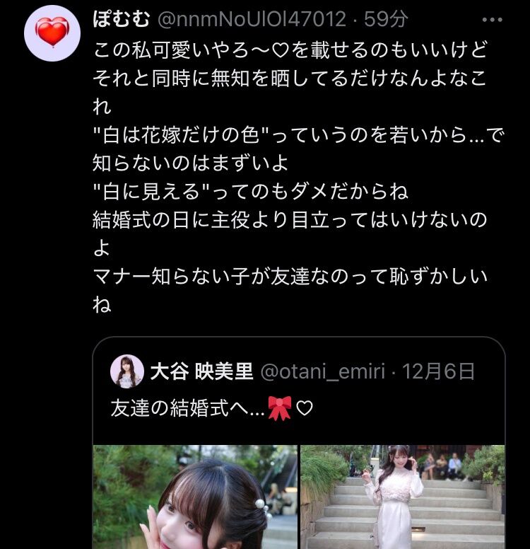 マナーマナーうるさいって言ってる人いるけど、参加者の方々が黒とか紺とか落ち着いた色合いの服ばかりのなか、ひとりだけ全身白に見えるドレス着てる子めちゃめちゃに目立つからな