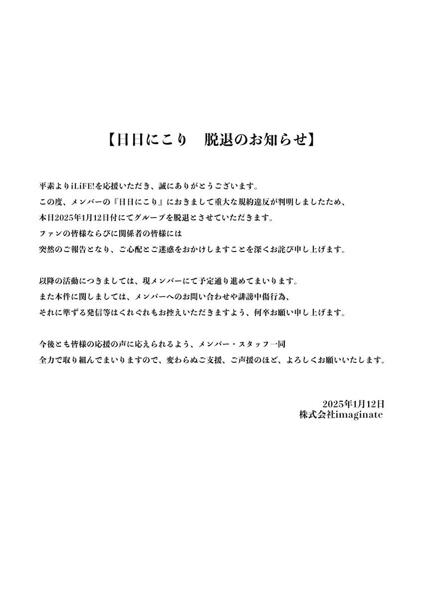2024年1月4日、過去の行動によりファンの皆様を不安にさせ、メンバーにも大きな負担や心配を掛けたとして