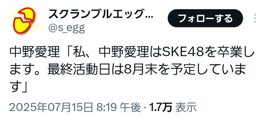 本日劇場公演にてご報告しました通り、Team S 中野愛理が2025年8月末をもって卒業させていただくこととなりました。