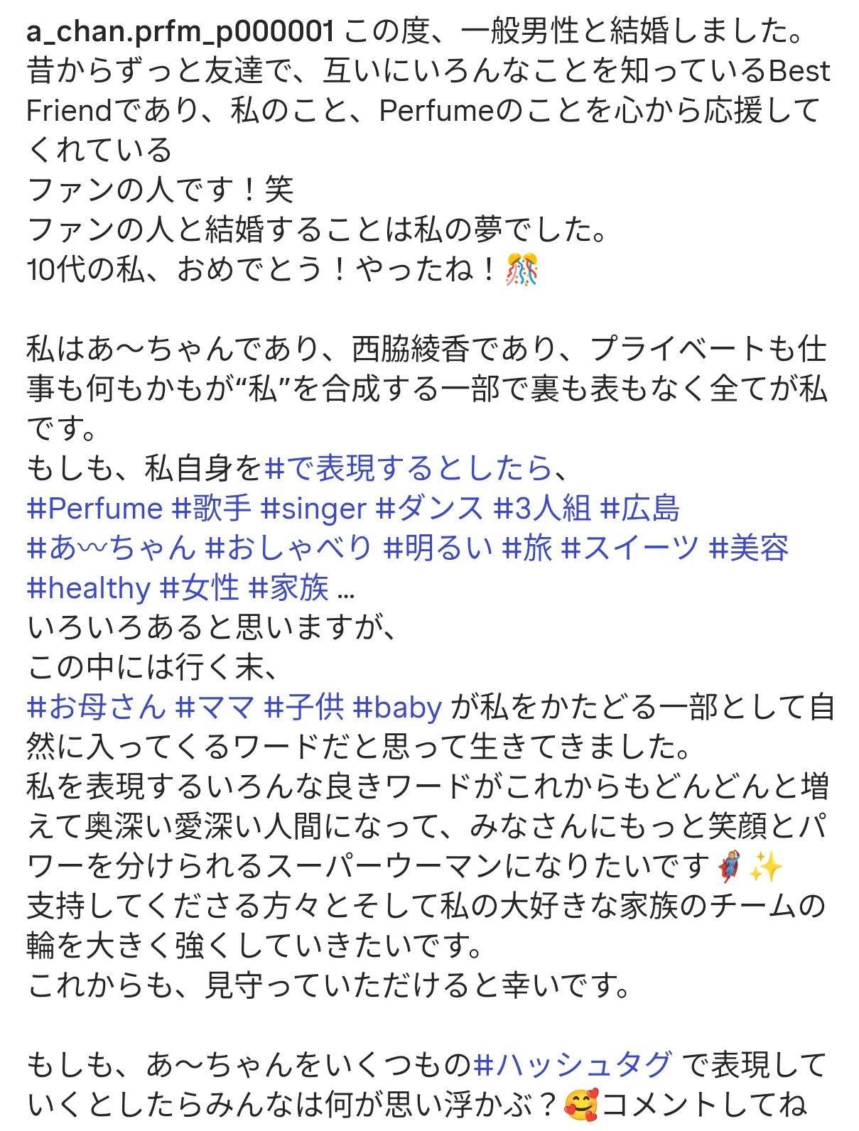 Perfumeあ~ちゃん、一般男性との結婚発表 お相手はファン「心から応援してくれている」【コメント全文】