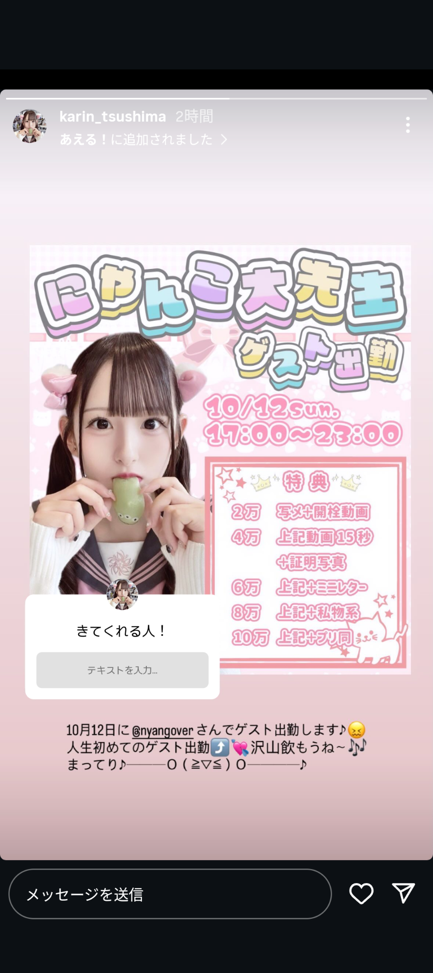 一般仕事してるらしいぞ今回は友達プロデュースのコンカフェで臨時的に働く感じだろ結構予約入りそうだ