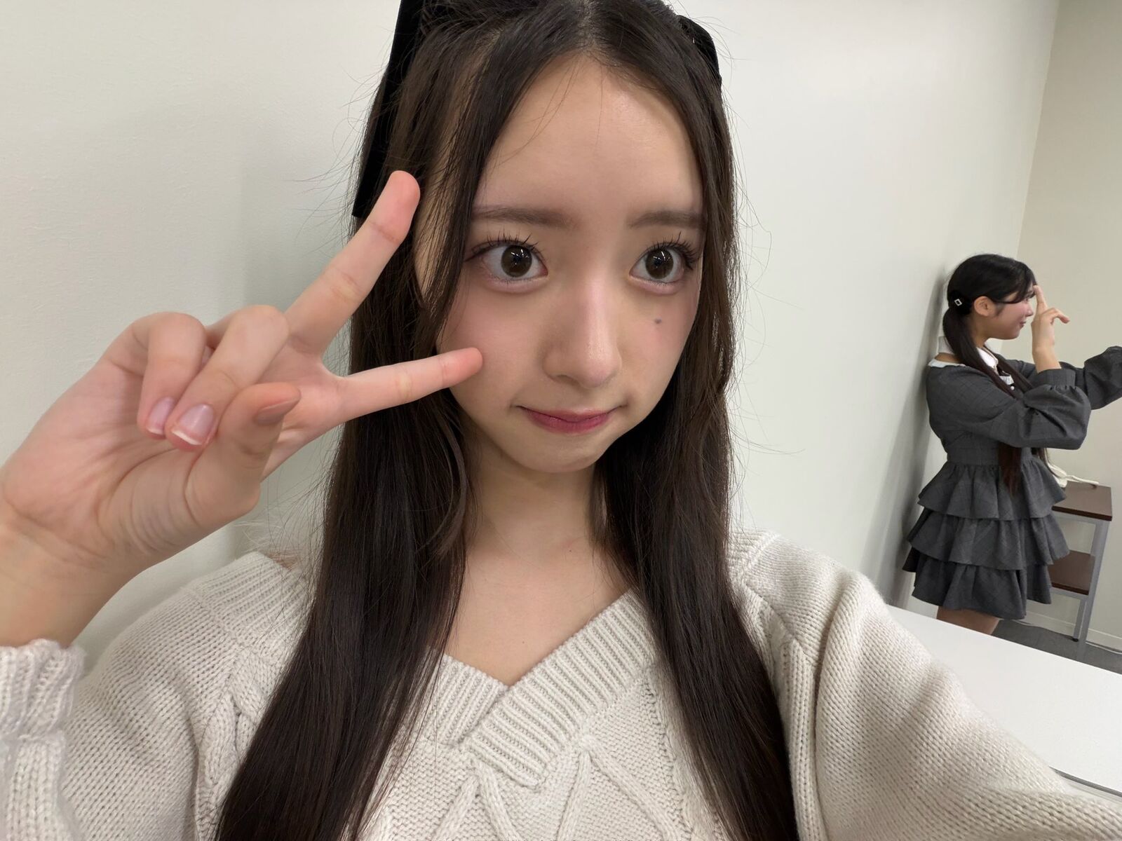 奥でピースして自撮りしてる子は誰?
