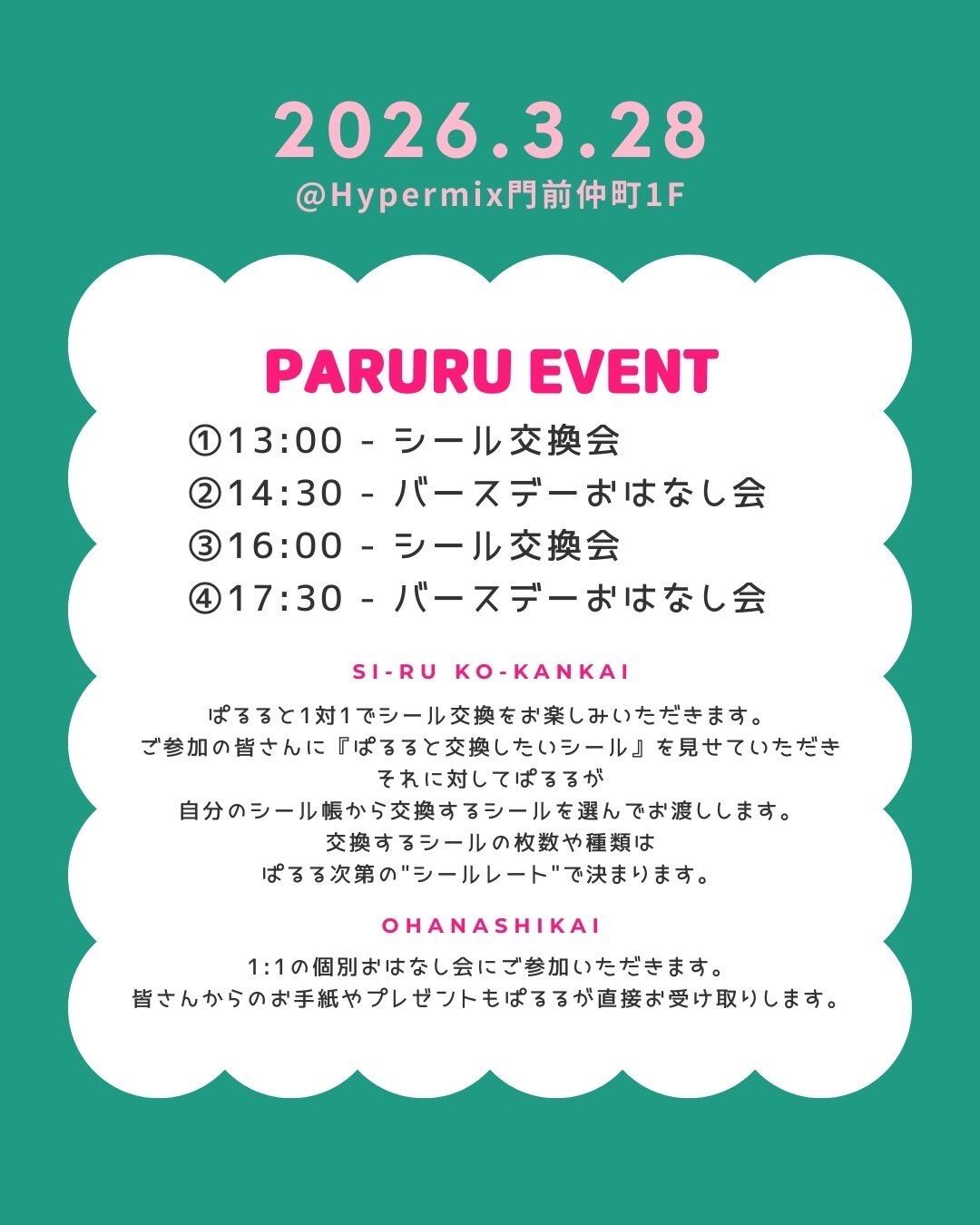 ※シールをお持ちでないお客様もご参加いただけますが、ぱるるからシールを受け取れるのは、シールをご持参いただき交換をご希望される方に限ります。