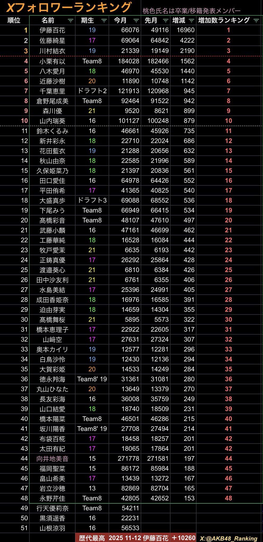 ⭐ 伊藤百花が歴代最高の増加数(伊藤百花 +10260)を更新